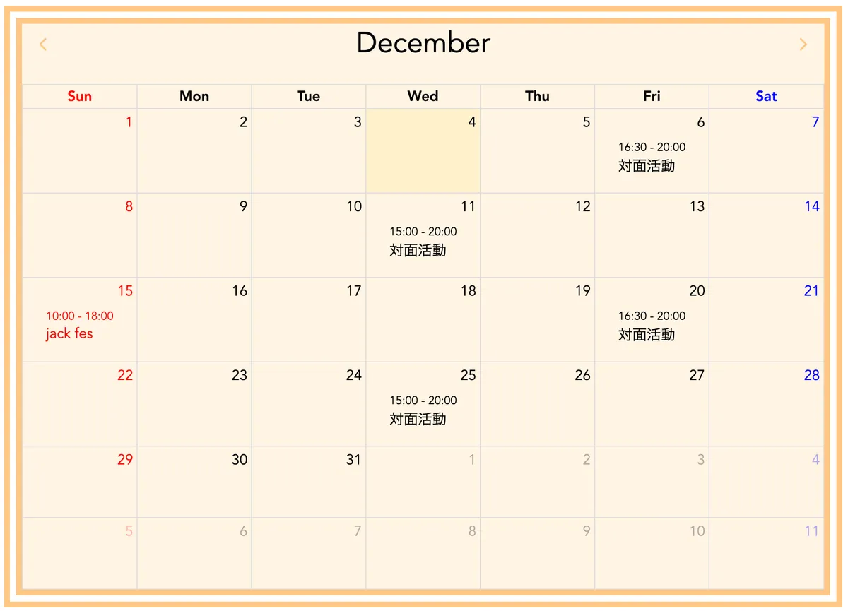 どこかで見たことありますね…😏? そうです、これはjackの公式サイトで使われているカレンダーです! jackの公式サイトでは、Google Calendarで管理しているサークルの活動スケジュールをFullCalendarを使って表示しています。見た目もjackカラーにカスタマイズしました。
