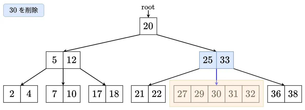 B木からの削除は場合分けが多くかなり複雑ですが,1つづつみていきましょう.