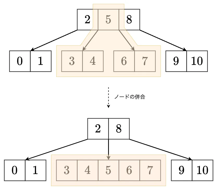 - を発見しますが,そのまま消すことはできません. の左の子と右の子のサイズがともに なので,それらをマージします.