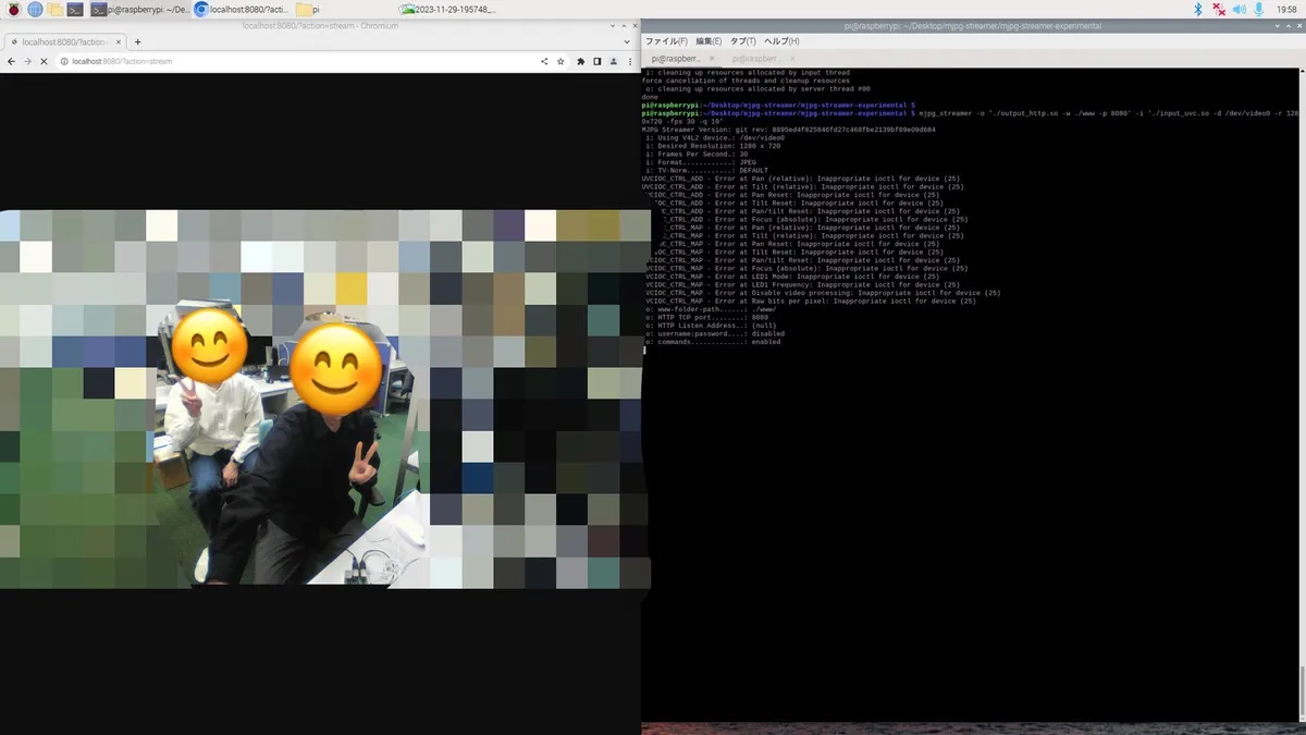 mjpg_streamer -o './output_http.so -w ./www -p 8080' -i './input_uvc.so -d /dev/video0 -r 1280x720 -fps 30 -q 10'ラズパイのChromiumでhttp://localhost:8080?action=streamを確認してみましょう