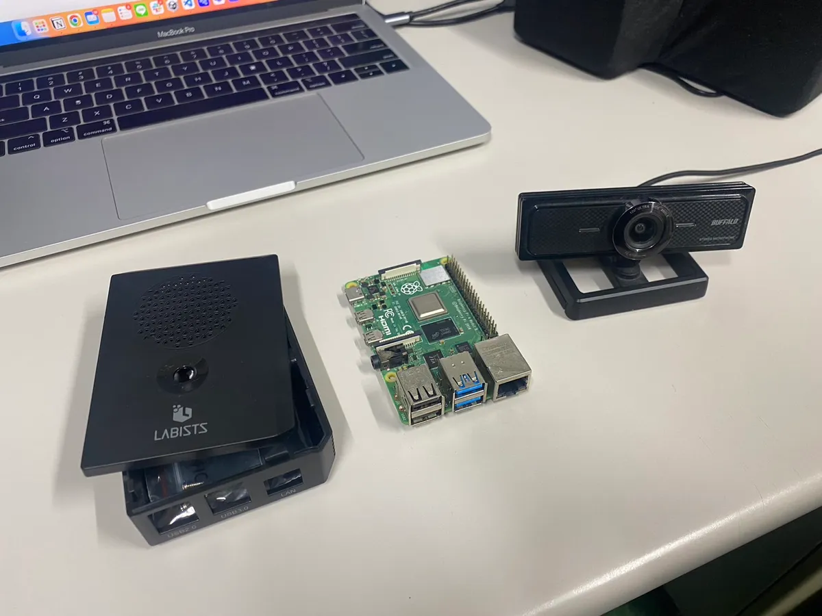 出席状況確認をする方法としては色々な方法が考えられます。ICカード、Bluetooth、感圧、照度、音声認識、画像認識、物体検出など数多にあります。今回は導入のしやすさと研究室メンバーに余計な手間をかけさせないという観点から「研究室内映像のリアルタイム配信」を採用しました。映像配信をやってみたかったというのも採用理由のひとつです。ICカードやBluetoothでも出席状況を確認できますが導入コストや運用の手間がかかるので不採用としました。配信機材としては、そこら辺にあったラズパイとUSBカメラが使えそうだったのでこれらを採用しました。