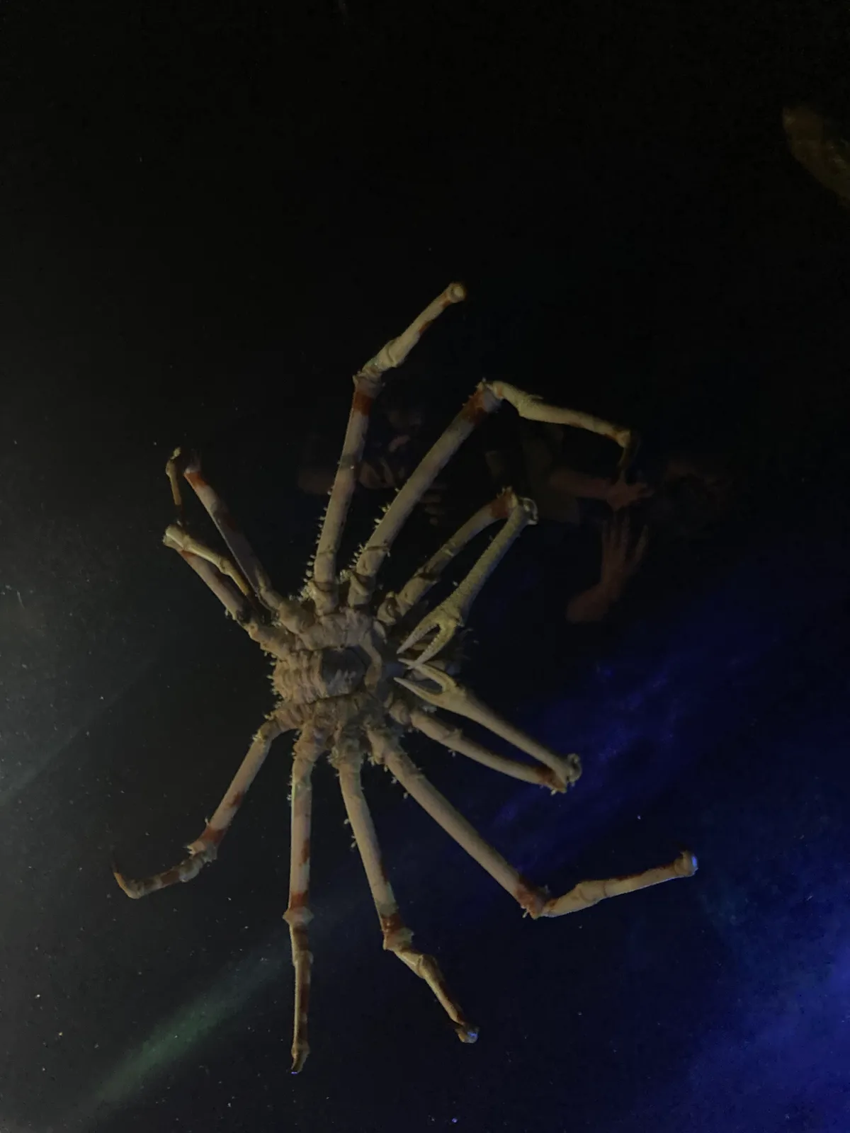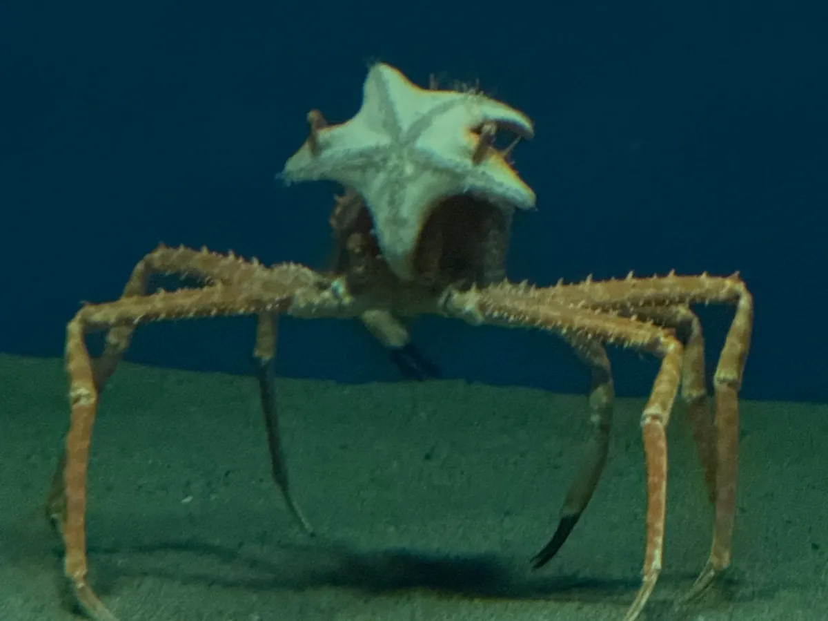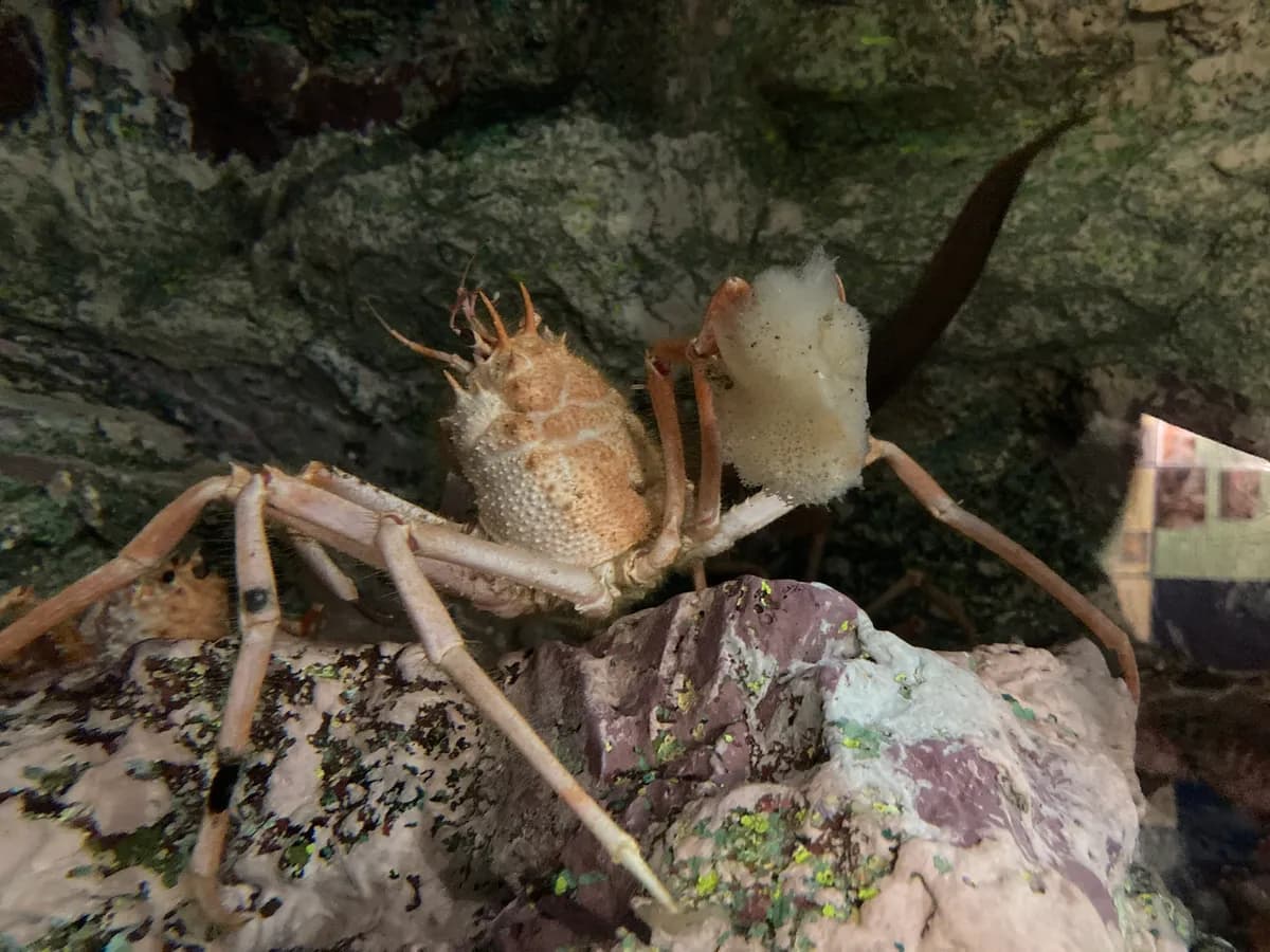 オオホモラの仲間は、後ろに突き出た鍵足に、獲物を差してゆっくり食べるのですが、餌の管理をミスると、同じ水槽の展示生物を背負ってしまうことも…