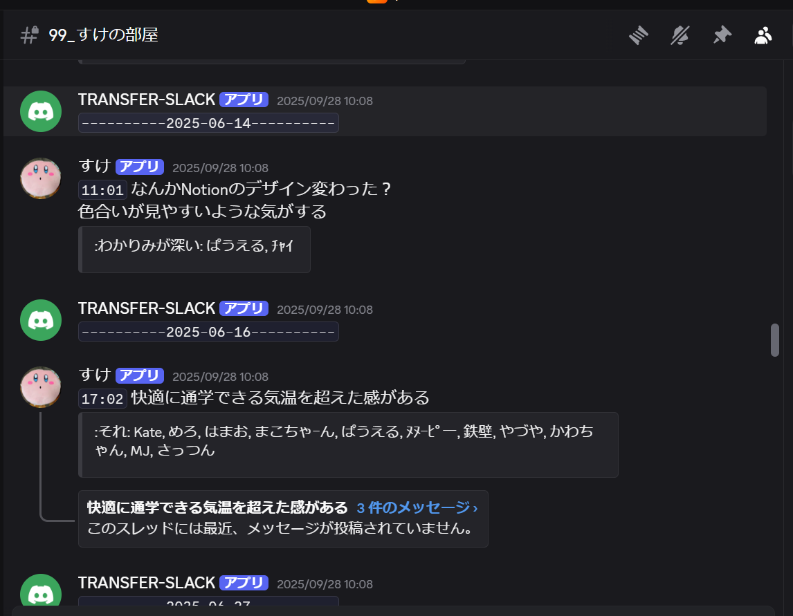 移行後のチャンネルはこんな感じです。Slackのスレッドもそのまま移行できています。