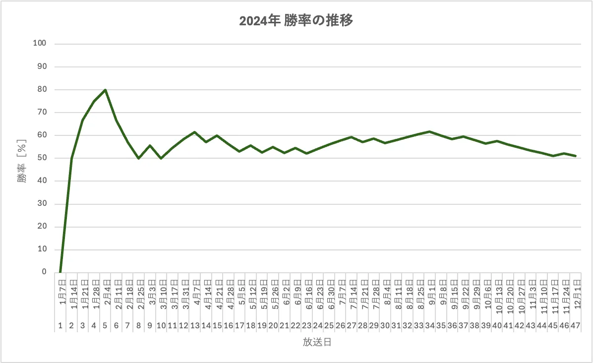 ちなみに、2024年を通した勝率の推移はこんな感じです。