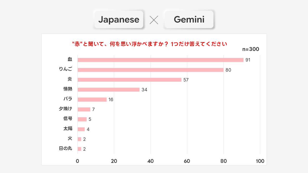 - 日本語(具体的・写実的) 「赤といえばりんご」という教育的な定型フレーズや、視覚的な具体性を重んじる言語慣習が強いため、AIは「モノ」としての具体的な名詞を優先して回答します。