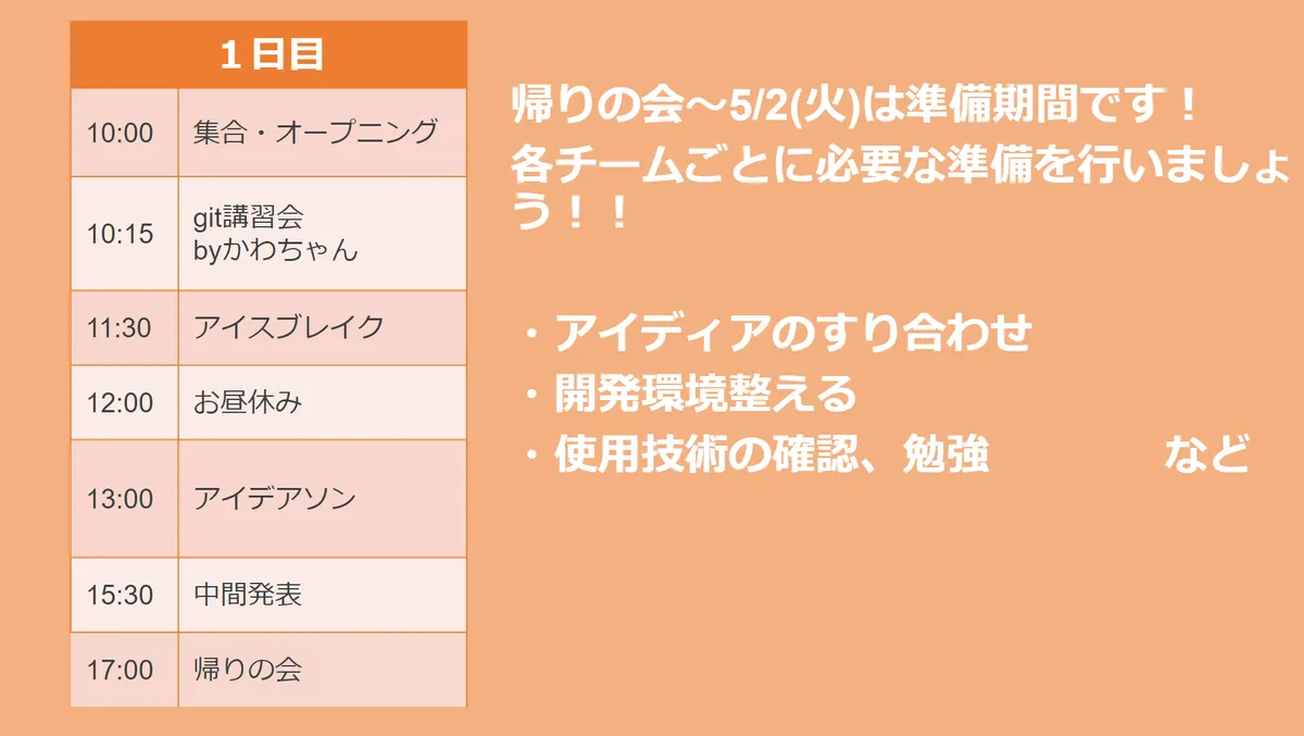ここから1週間はチームごとに勉強をすすめます、環境構築など色々進めていたようです。