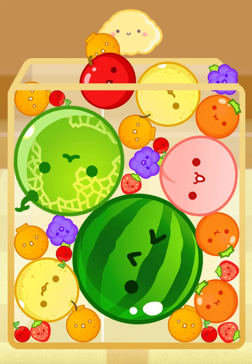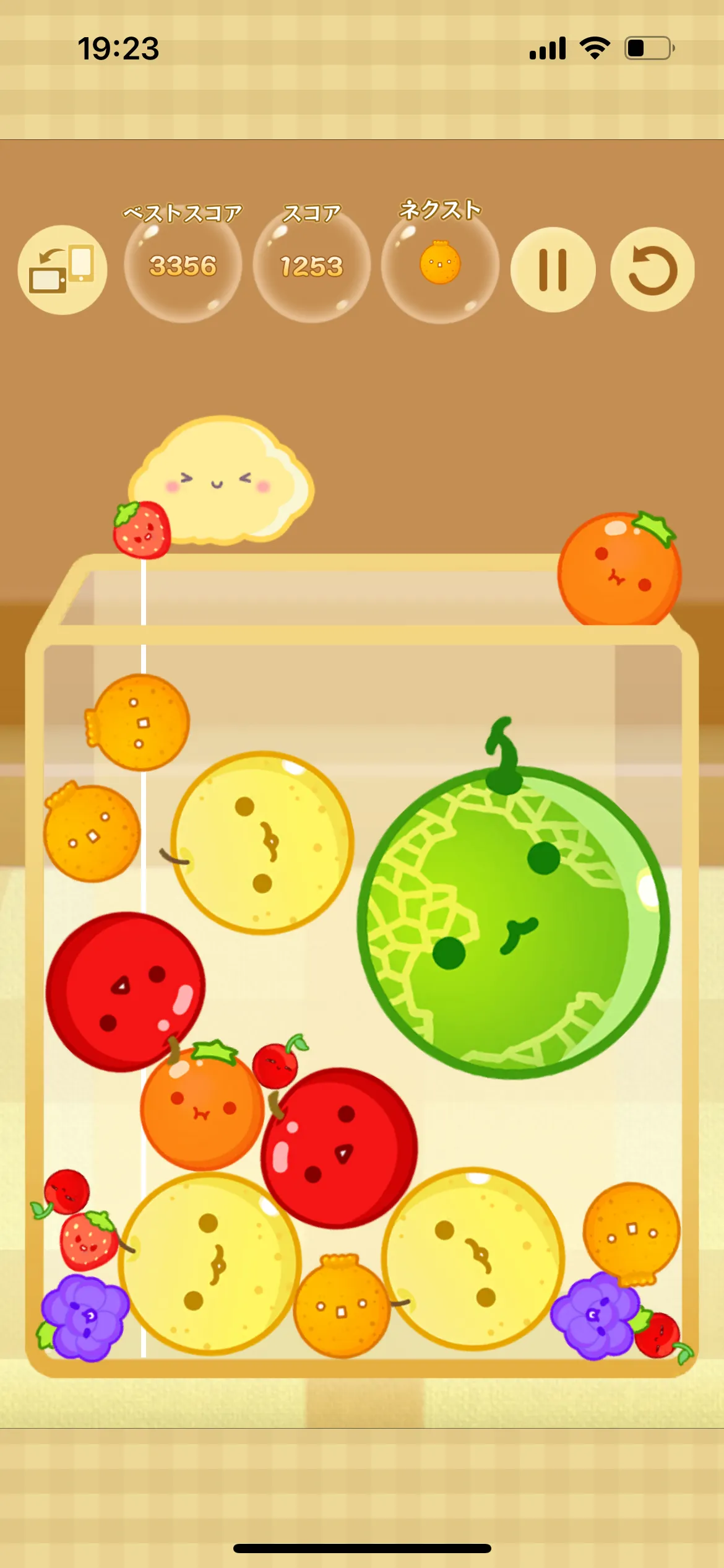 同じ種類のフルーツをぶつけてシンカさせていくわけですが、落ちてくるフルーツの種類が5つもあり、予測できません。