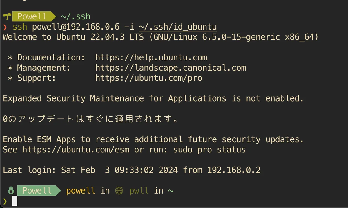 $ ssh -i <うまくいかないときは、ネットワークがサーバー側とクライアント側で同じかどうか確認してみてください(自分はこれで数十分溶かしました😭)