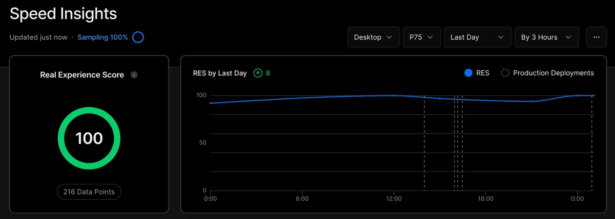 Vercel上でパフォーマンスを確認できますが、爆速ですね。