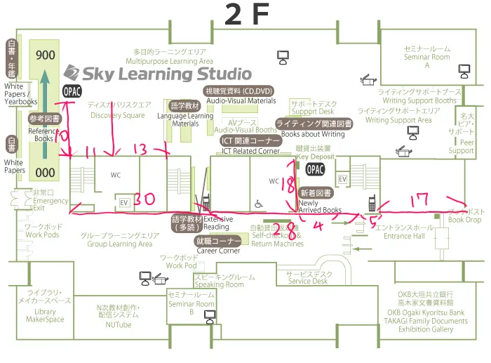左下のディスカバリースクエアが活動場所でした。本棚とかも含めてこの辺は力を入れて作りました。