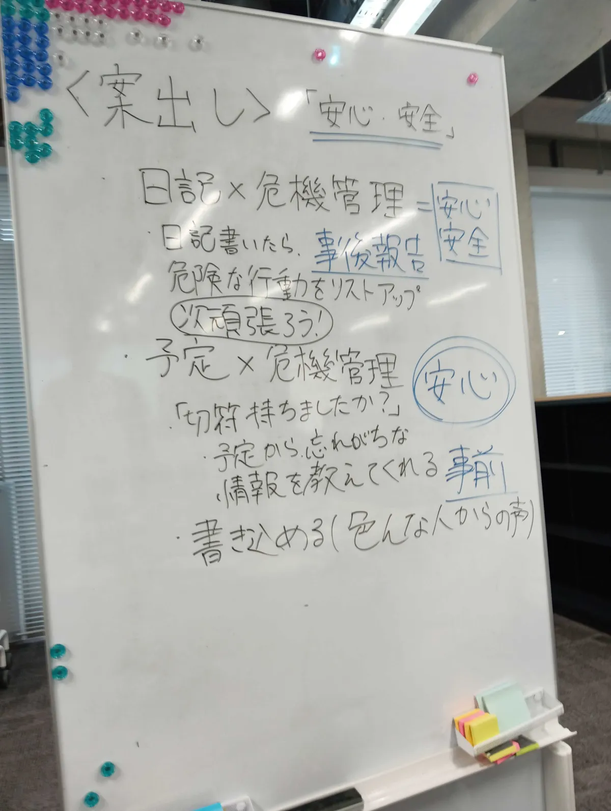他のチームが着々と開発を進める中、僕らはホワイトボードを取り出し、異様な雰囲気をまといながらアイデア出しから始めることとなりました。3人チームかつ内1人は初心者…総合的な技術力で言えば他チームより劣る僕らの目標は「楽しく開発して何かしら完成させること」、「あわよくばスポンサー賞?」に決まりました。