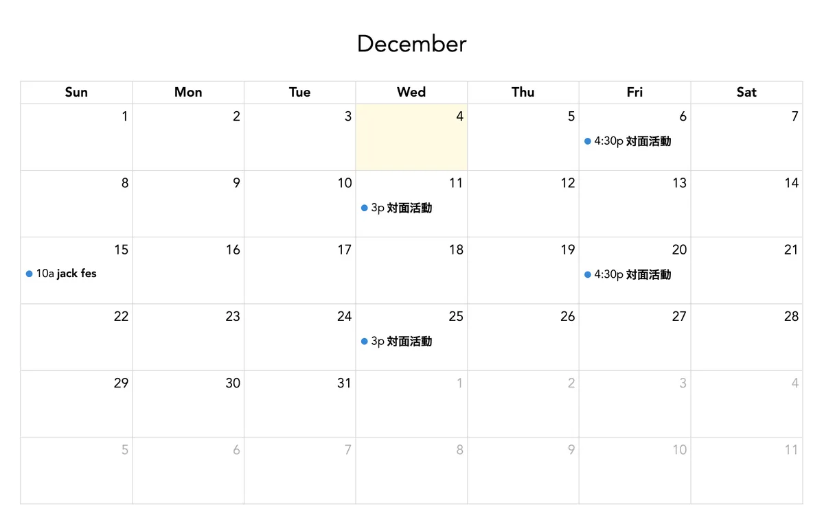どこかで見たことありますね…😏? そうです、これはjackの公式サイトで使われているカレンダーです! jackの公式サイトでは、Google Calendarで管理しているサークルの活動スケジュールをFullCalendarを使って表示しています。見た目もjackカラーにカスタマイズしました。