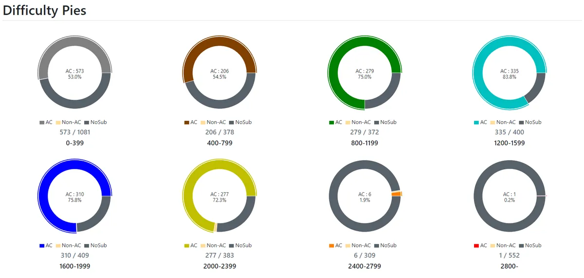 全部で 2200 問くらい解きました.何かの記事で 3000 問解けば黄色になれるみたいなことが書いてあった気がするので,それより少なく済んでよかったです.