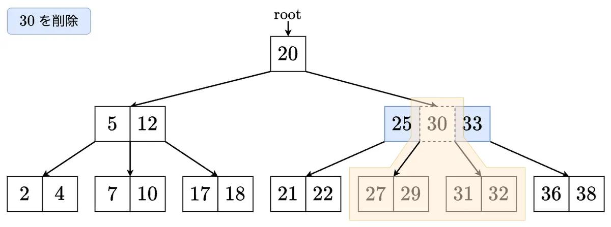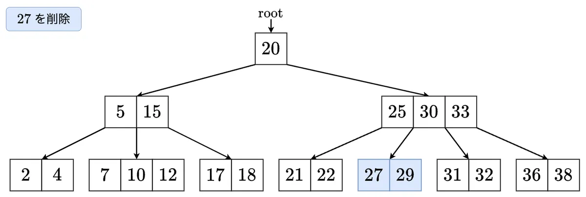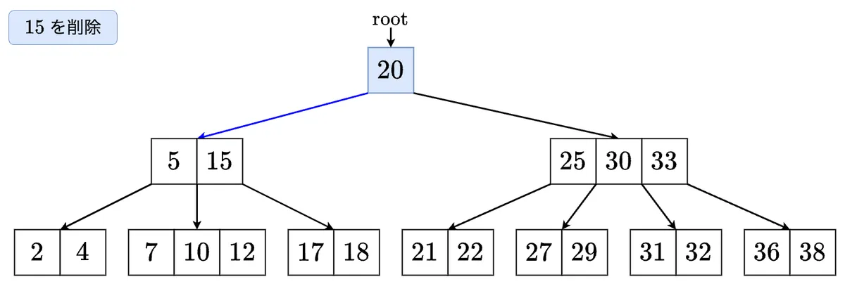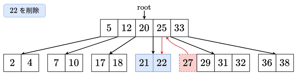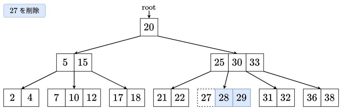 - 削除した最小値を左の子に移します.これで左の子のサイズが 以上になりました! の左の子に移動します.
