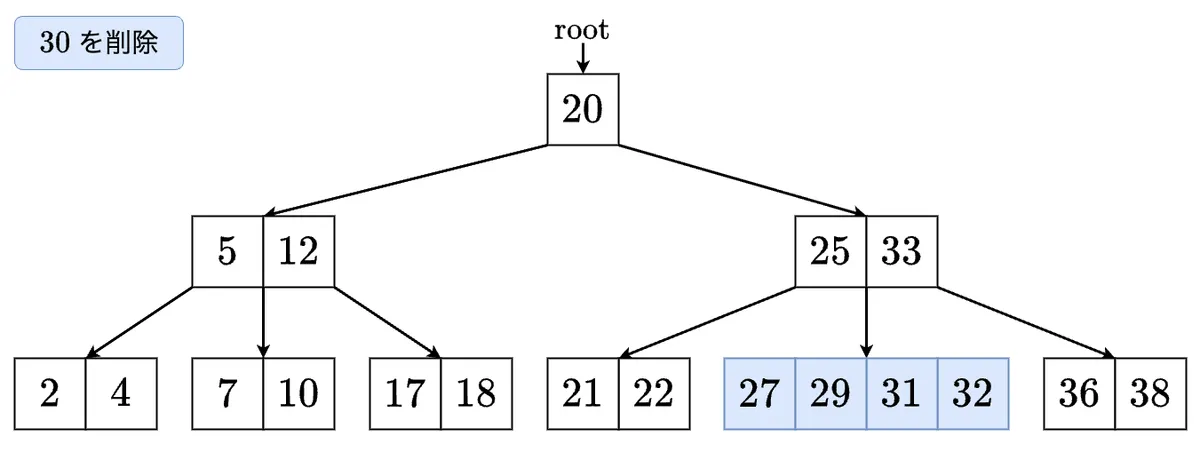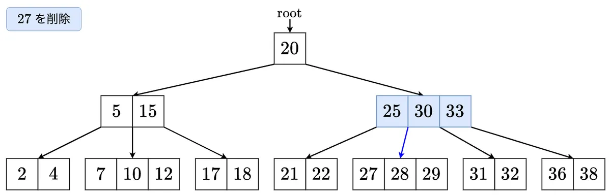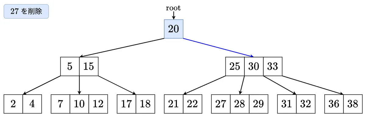 - キー がノード に存在しないとき,キー を部分木に含むような の子 を特定する. のサイズが のとき,ステップ3-1, 3-2のいずれかを実行し, の適切な子に再帰する.
